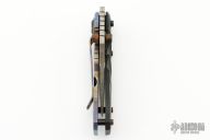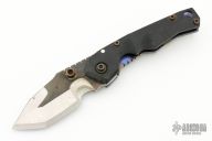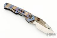 This TripWire by Dwaine Carrillo features a two-tone finished blade with dual thumbstuds and notched thumbrest. Black G-10 and anodized titanium frame and pocket clip for tip down carry. Strong lock up and nice detent. Has some scuffs and scratches, has some patina/oxidation, otherwise good user condition.