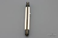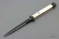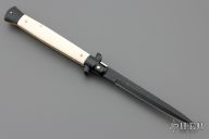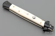 This Swivel Bolster by Frank Beltrame features a black bayonet ground blade with false top edge. The handle has black stainless steel bolsters, front and rear, imitation ivory scales, brass liners, stainless spring. Excellent condition. Comes with a zippered case.