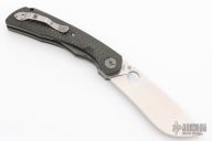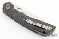 The Nati Amor designed Spyderco Subvert is a large folding knife revealed at Spyderco's 2018 Amsterdam Meet. This folder sports a clean, balanced aesthetic based on Nati's handmade Sabotage custom. It features carbon fiber scales over thick bead blasted titanium liners. Its blade has a satin finish, high flat grind, and a generously bellied edge. Add a unique Nati Amor design to your collection today! Features: A heavy duty titanium liner lock offers dependable blade lock up. Stainless steel clip for tip-up pocket carry. 3D textured G-10 handle scales provide a secure and comfortable grip. Comes with original zipper case. Excellent condition.