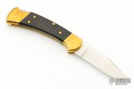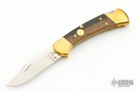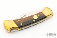 This BUCK 112 is an automatic conversion. It is the real deal. Beautiful piece with brass bolsters and dark wood scales. Trigger button is on the A side and is brass. Strong action. Has a scratch on one of the scales, otherwise excellent condition. Comes with a zippered case.