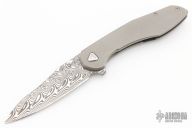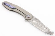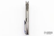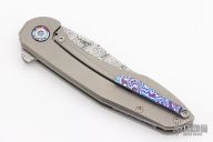 This Mini Tolk by Brad Southard features a Damasteel blade with notched thumbrest and flipper. The handle has a bead blasted titanium frame with Timascus tip up clip, satin hardware, Timascus backspacer, lanyard pin, Timascus pivot collar. Has a stainless lockface insert with overtravel stop. Rices on bearings, nice detent, lockup and blade seating. This knife is exquisite! Comes with original box and COA. Dated Feb 2020 inside frame. Excellent condition.