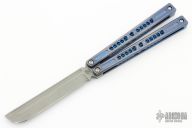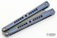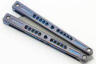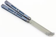 This Solo balisong by Hansen Metals features a milled, bead blast finish straight-back blade. The handles are comprised of anodized titanium with bronze phosphorus washers and steel bushings. Comes with Zippered case and COA. Excellent Condition.