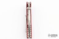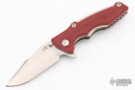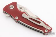 This Eklipse Tri-Way by Hinderer Knives features a stonewashed harpoon spanto blade with dual thumbstuds, flipper and notched thumbrest. The handle has a stonewashed titanium frame with red G-10 scales and titanium clip and hardware. Nice detent, lockup and blade seating. Comes with original box, card and extra washers. Excellent condition.