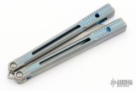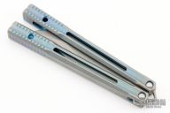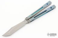 This balisong by JK Design features a milled, bead blasted, upswept recurve clip point bade. The handles are anodized titanium with milled full channel, bronze phosphorus washers and steel bushings.  Comes with a padded case and stickers. Excellent Condition.