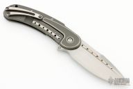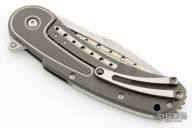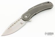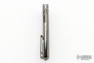 This EDC friendly framelock features a satin finished blade with fullers, swedge, and notched rest for thumb placement. The titanium handle is tumbled/machined to give a two-tone finish. This is a very comfortable knife that flips well and locks up with no play. Blade is centered when closed. Excellent condition.
