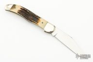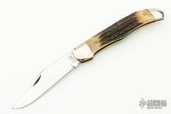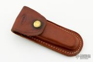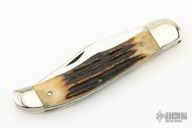 This Trapper by Ka-Bar was made in the 60's, it features a mirror polished blade with nail nick. The handle has nickel silver bolsters, front and rear, stag covers, brass liners, steel springs, lanyard hole at the butt. Excellent condition for its age. Just some minor patina and some light scratches. Comes with original brown leather sheath.