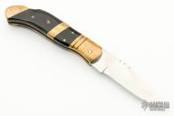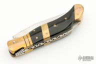 This knife by Laguiole features a mirror polished clip point blade with a nail nick and fileworked spine.  The handle features brass bolsters/liners over a fileworked steel backspring and buffalo horn covers. Has some light scratches, otherwise excellent condition.  Comes with original black leather sheath.