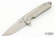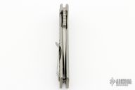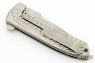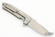 This VECP Flipper by Les George features a tumble-finished CNC flat ground blade and a milled and tumble finished titanium frame with matching tip up clip. Hinderer lock bar stabilizer. Caged bearings. Smooth action. Excellent blade seating, detent and lockup. Includes zippered case and patch. Excellent condition.