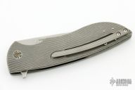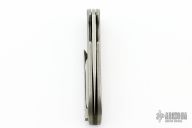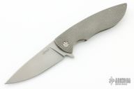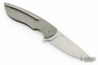 This Sting Flipper by Herman Knives features a tumbled blade and flipper. The handle has a milled titanium frame, titanium liner and tip up clip and carbon fiber backspacer. Nice detent, lockup and blade seating. Rides on bearings.  Comes with original box and COA. Excellent condition.