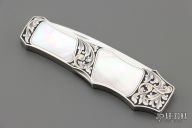 This Interframe lockback folder from Jack Busfield features a hand rub satin finished blade with nail nick. The handle is comprised of an engraved stainless steel frame with sea snail inlays and stainless steel lock spring. Excellent condition. The handle has been engraved with gold inlaid engraving, it is marked with an "R" on the edge of the frame.  Comes with a zippered case. Excellent condition.
