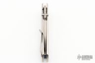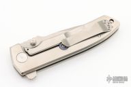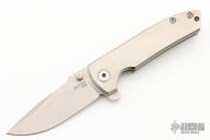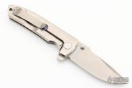 This VECP Flipper by Les George features a tumble finish CNC flat ground blade and a orange peel finished titanium frame with matching tip up clip. Hinderer lock bar stabilizer. Caged bearings. Smooth action. Nice blade seating, detent and lockup. Includes zippered case and patch. Excellent condition.