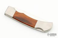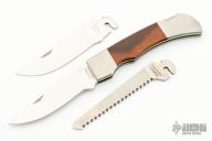 This lockback folder by Gerber International comes with 3 interchangeable blades that are mirror finished with nail nicks. The handle has a stainless steel frame with dymondwood inlays. Comes with original sheath that holds all the extra blades. Excellent condition.