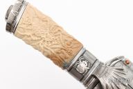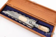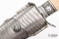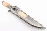This Sole-Authorship Fighting Bowie by Michael Andersson features a multi-bar mosaic Damascus blade with a really cool mosaic Damascus spider in the middle, false top edge, .211" blade stock and 1.834" blade depth, hidden tang construction. The handle has a mirror polished stainless steel collar, hand carved and fluted Damascus guard, fully carved mammoth ivory grip with fluted Damascus and stainless steel spacers, Damascus butt. Comes with a beautiful twist Damascus sheath with inlaid carved mammoth ivory. Comes with a wooden display box. Excellent condition. Truly a stunning piece.