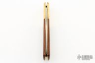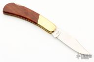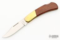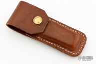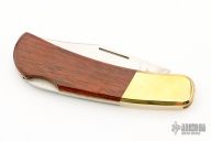 This vintage lockback by Kershaw features a satin finished blade with nail nick. The handle has brass bolsters and liners. The scales are rosewood. Has some light scratches, otherwise excellent condition. Comes with a brown leather sheath.