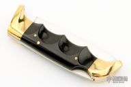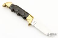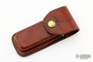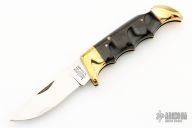This Folding Field Model 1050 by Kershaw features a mirror polished drop point blade with notched thumbrest and nail nick. The handle has brass bolsters and liners, black scales. Has some scratches, dings in the edge, has been resharpened, a crack in one of the scales near a pin, otherwise good user condition. Nice lockup and blade seating. Comes with original brown leather sheath.