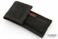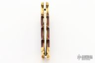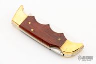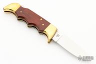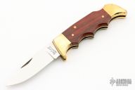 This vintage lockback by Kershaw features a mirror polished blade with nail nick. The handle has brass bolsters and liners. The scales are rosewood. Has some light scratches, otherwise excellent condition. Comes with a black nylon sheath.