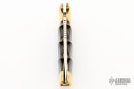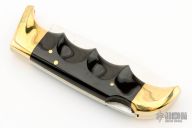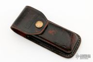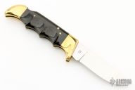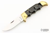 This Folding Field Model 1050 by Kershaw features a mirror polished drop point blade with notched thumbrest and nail nick. The handle has brass bolsters and liners, black scales. Has some light scratches, otherwise excellent condition. Nice lockup and blade seating. Comes with a black leather sheath.