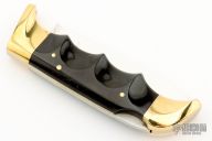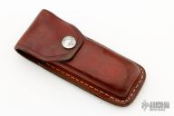 This Folding Field Model 1050 by Kershaw features a mirror polished drop point blade with notched thumbrest and nail nick. The handle has brass bolsters and liners, black scales. Has some light scratches, otherwise excellent condition. Nice lockup and blade seating. Comes with brown leather sheath.
