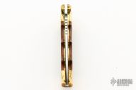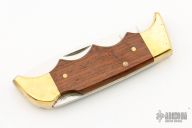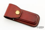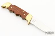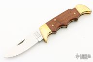 This vintage lockback by Kershaw features a mirror polished blade with nail nick. The handle has brass bolsters and liners. The scales are rosewood. Has some light scratches, otherwise excellent condition. Comes with a brown leather sheath.