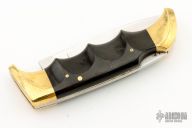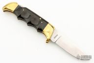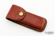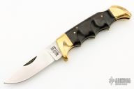 This Folding Field Model 1050 by Kershaw features a mirror polished drop point blade with notched thumbrest and nail nick. The handle has brass bolsters and liners, black scales. Has some scratches and dings, otherwise good condition. Nice lockup and blade seating. Comes with brown leather sheath.