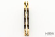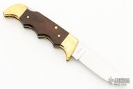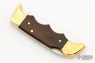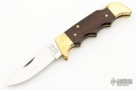This vintage lockback by Kershaw features a mirror polished blade with nail nick. The handle has brass bolsters and liners. The scales are rosewood. Has some scratches, otherwise good condition. Comes with a brown leather sheath.