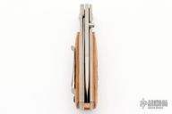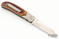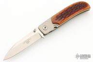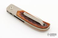 This TTF-6 linerlock folder by Bob Terzuola features a tumbled blade with a thumbstud. The handle has a bead blasted titanium frame with jigged bone scales, tip up titanium clip. Smooth action. Nice detent, lockup and blade seating. Excellent condition.