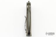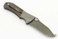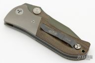 This MTX2 D/A side opener has a OD green blade, bead blasted titanium bolsters, and green canvas micarta scales, stainless steel liners. Black coated titanium clip. Leaf spring bolster release. Dated 05/2004 and #0544. Includes sheath. Excellent condition.