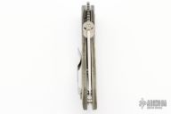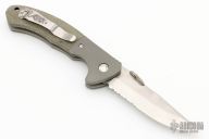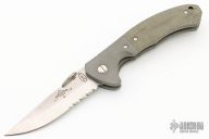 This PoBoy Emerson TKO (Tim Kennedy Knife) features a stonewashed partially serrated blade with a custom thumbdisc. The handle has bead blasted and dovetailed titanium bolsters, green canvas micarta scales, bead blasted titanium liners, tip up stainless steel clip. Comes with original box, scales and papers. Excellent Condition. #086