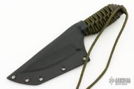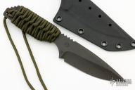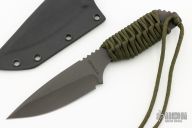 This SA-L by Mick Strider features a black drop point blade with a notched thumbrest, .131" blade stock and 1.307" blade depth, full tang construction. The handle has paracord wrap. Comes with a kydex sheath. New condition.