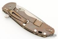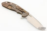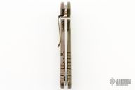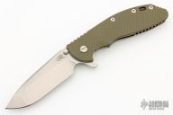 This XM-24 by Rick Hinderer features a stonewash finished blade with swedge, dual thumb studs, notched thumb rest and flipper. The handle is comprised of a textured green G-10 scale over titanium liner on the "A" side and a tumbled titanium and anodized lock side over titanium barrel spacers. The titanium pocket clip is reversible for tip up/down, right hand carry. Includes original box, papers, and hardware. New condition.
