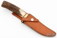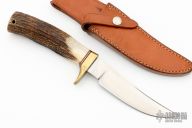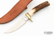 This is a vintage non-dot Lile model 19 made by Jimmy himself and features a stag handle with brass guard and red and brass spacers. Satin finished upswept blade, .179" blade stock and 1.115" blade depth, hidden tang construction. Includes a brown leather sheath. Has some scratches, otherwise excellent condition.