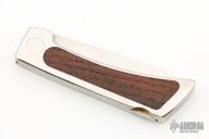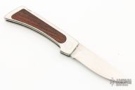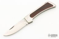 This Lockback Folder by Jimmy Lile features a satin finished blade with nail nick. The handle has a stainless steel frame with cocobolo inlays and stainless steel backspacer. Nice blade seating and lockup. Has some light scratches, otherwise excellent condition for its age.