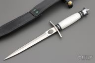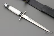 This is a copy of the famous Case V42 dagger made for the First Special Service Force [ FSSF ] the famous " Devil's Brigade " during World War Two. It is made by Taylor Cutlery. Has a satin finished double edged blade with .157" blade stock and .717" blade depth, hidden tang construction. The handle has a stainless steel guard and butt with a pearlex grip. Comes with original black leather sheath and box. Excellent condition.