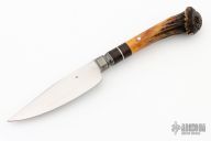 This hunter by Journeyman Smith Jim Poling features a hand rub satin finished blade with false top edge, .240" blade stock and 1" blade depth, hidden tang construction. The handle has an integral bolster, crown stag grip, stacked leather and nickel silver. Comes with a zippered case. Has some light scratches, otherwise good condition.