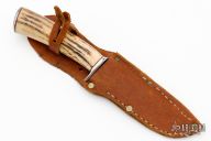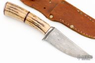 This Skinner from Wayne Goddard features a Damascus blade with .126" blade stock and 1.219" blade depth, hidden tang construction. The handle has a stainless steel guard and butt with a two-piece stag grip. Includes leather sheath with belt loop and a zippered case. Has some light patina, otheriwwse excellent condition.