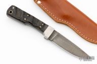 This knife by Gerome Weinand features a Damascus blade with .152" blade stock and .984" blade depth, full tang construction.  The handle features a textured stainless steel guard and kudu horn scales.  Includes a brown leather sheath and a zippered case. Excellent condition.