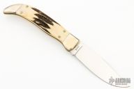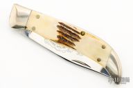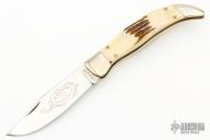 This Ka-Bar slipjoint is dated 1986. It has nickel silver bolsters, stag scales, brass liners, and stainless steel spring. Comes with a zippered case. Has a few light scratches, otherwise excellent condition.