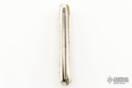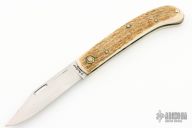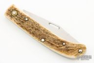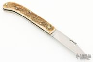 This slipjoint by Jerry Van Eizenga features a hand rub satin finished blade with nail nick hole. The handle has stag scales, nickel silver liners and a stainless steel spring. Has half-stop. Nice blade seating. Has some oxidation on the blade, otherwise good condition. Comes with a zippered case.