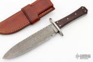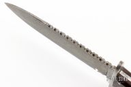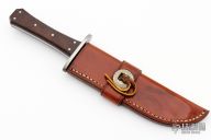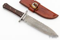 This Bowie by Rick Bear Bone Smith has a Cable Damascus blade with fileworked spine and false top edge, .171" blade stock, 1.473" depth. Coffin style handle is gorgeous desert ironwood burl with stainless steel pins and guard. Comes with a brown leather sheath with nickel silver concho. Comes with a zippered case. Has a few light scratches, otherwise excellent condition.