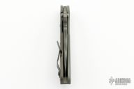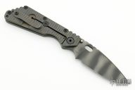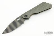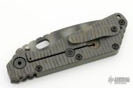 This SMF framelock folder by Mick Strider features a tiger striped drop point blade and a dimple pattern bronze aluminum and flamed titanium frame and tip up titanium clip. Includes a "Lock Bar Stabilizer" for maximum reverse lock retention. Nice detent, lockup and blade seating. Excellent condition.