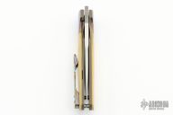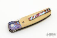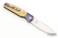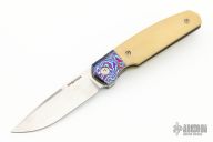 This Caballero Front Flipper by Enrique Pena features a hand rub satin finished drop point blade with swedge, and notched thumbrest. The handle has mokuti bolsters, a blasted titanium liners, with mokuti tip up clip, canvas micarta scales. Titanium standoffs. Includes padded and zippered case. Nice detent, lockup and blade seating. Excellent condition.