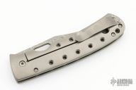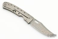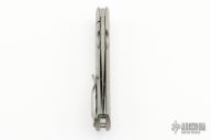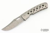 This Custom Bowie Framelock by Tom Mayo features a Damasteel blade with false top edge and thumbhole. The handle has a bead blast titanium frame with titanium tip up clip, mosaic pin pivot. Smooth action. Nice detent, blade seating and lockup. Comes with a Velcro case. New from maker at the 2023 USN Gathering.