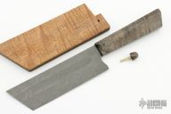 This Nakiri by Farias Knives features a 5” acid stonewashed S35VN blade with a 62 HRC, has fullers, .133" blade stock and 1.894" blade depth, hidden tang constrution. The handle has Stabilized Hawaiian mango woo grip, vintage micarta frame & micarta pin. The scabbard is made from Hawaiian mango with a pin that matches the handle. New from maker at the 2023 USN Gathering.