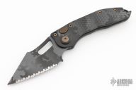 This Stitch Auto by Microtech Knives features a fully serrated urban camo coated blade and false top edge, notched thumb and finger rests. The handle has an urban camo coated anodized and milled aluminum handle with a titanium backspacer, stainless steel hardware and clip, tip up carry, lanyard hole at the butt. Comes with original box and papers. S/N of 004 and dated 11/2022. Excellent condition.