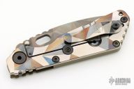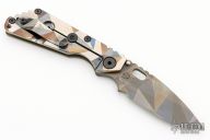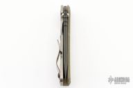 This SNG framelock folder by Mick Strider features a battleship finished blade and a frag pattern G-10 and battleship finished titanium frame and tip up titanium clip. Includes a "Lock Bar Stabilizer" for maximum reverse lock retention. Nice detent, lockup and blade seating. New condition.