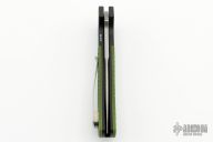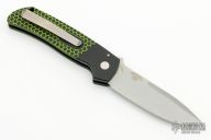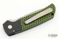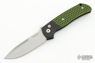 This ATCF Auto by Pro-Tech features a stonewashed Magnacut blade with notched thumbrest. The handle has a black aluminum frame with hexagon milled black/green G10 scales, tip up milled titanium clip with hidden screws.  Pearl inlaid push button. Comes with original box and papers. New from maker!