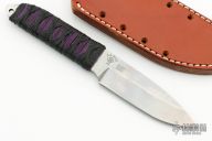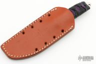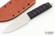 This Boss Fixed Blade by Ka-Bar that is a Mike Snody design. This one has been given a custom epoxy soaked cord wrapped handle by Mike's son Michael Snody. Stonewashed chisel ground blade with notched thumbrest, .127" blade stock, .992" blade depth, full tang construction. Comes with a brown leather sheath. New from maker at the 2023 USN Gathering.