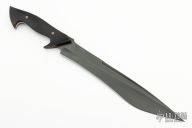This Fighter by Alex Hossom features a black blade with sharpened top edge and notched thumbrest, .188" blade stock and 1.929" blade depth, full tang construction. The handle has black linen micarta scales with mosaic pins and red liners. Comes with a zippered case. New from maker at the 2023 USN Gathering.