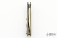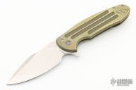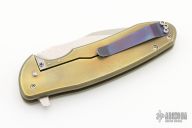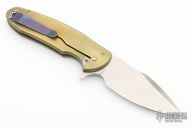 This Fortis by Ferrum Forge features a tumbled drop point blade with swedge, notched thumbrest and flipper. The handle is comprised of a milled, tumbled and anodized titanium frame over anodized barrel spacers. The anodized titanium pocket clip is positioned for right hand, tip up carry. Has a couple light scuffs, otherwise excellent condition.