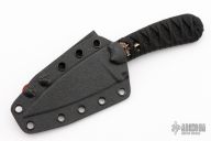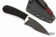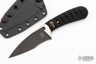 This SIN by Bastinelli Knives features a black finish recurve blade with notched thumbrest and fullers, .136" blade stock and 1.15" blade depth, full tang construction. The handle has a custom cord wrap and a bronzed menuki. Comes with kydex sheath and zippered case. New from maker!